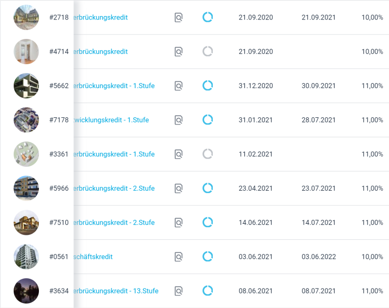 Hier siehst du mal wie die Portfolioübersicht aussieht. Die mit den grauen Kreis, sind bereits zurück gezahlt. Ansonsten entspricht das erste Datum dem Finanzierungsdatum und das zweite Datum, wann ich das nächste mal eine Rückzahlung erhalte.